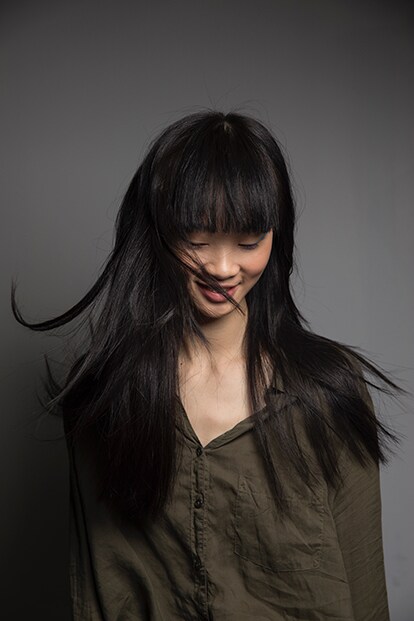 “We’re working with the hair’s natural bends and texture so it doesn’t feel too done,” said Frank. “It’s like you got stuck in the rain — we didn’t want it to look like a blow dry.” To enhance model’s natural texture, Frank and team used Texture Tonic styling spray and gently twisted sections of hair to give it just a touch of wave.