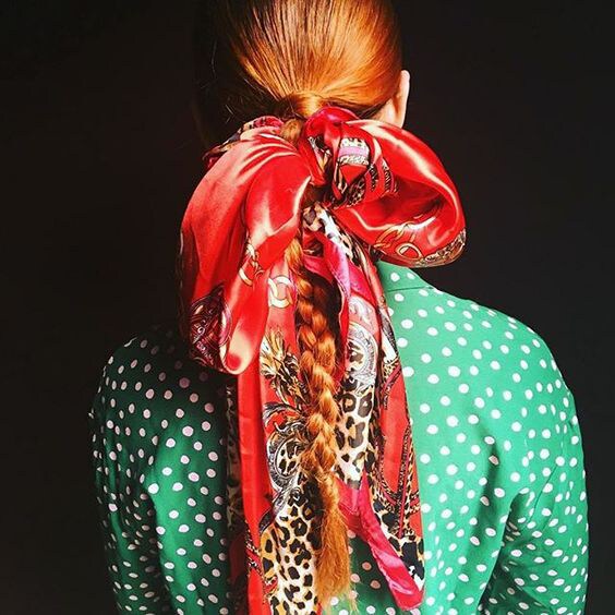 Upgrade your go-to braids and ponytails with a scarf for a touch of fun. Pro tip: Hit up secondhand shops and vintage stores for unique printed scarves of all lengths and fabrics so you can easily mix things up. We love how Aveda Artist Lisa at Sloane’s Bespoke Hair gave this simple braid a boost with a printed scarf.