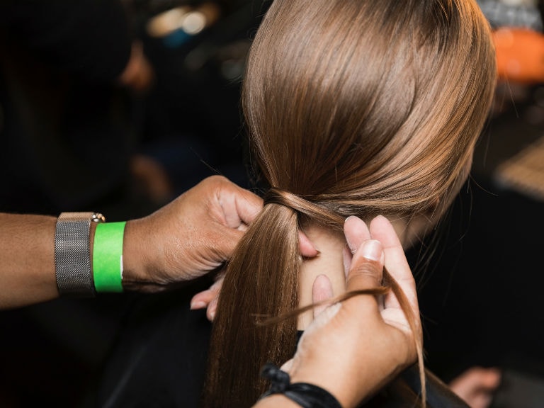 #AvedaArtist Tip:“To achieve a more put together pony, take a small piece of hair from underneath the ponytail and wrap it around the elastic. Then pin in place. This technique conceals the elastic from view,” Tippi says.