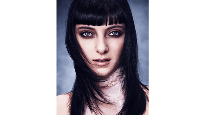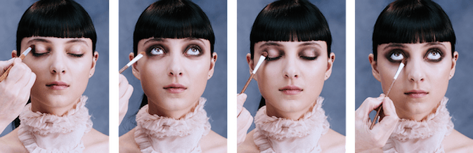 7 Encircle the eyes with Petal Essence™ Eye Definer in Black Orchid, winging out slightly at the outer corners of the top lash lines, and diffuse with the Eye Smudger Brush. Apply the same shade along the inner rims of the eyes.