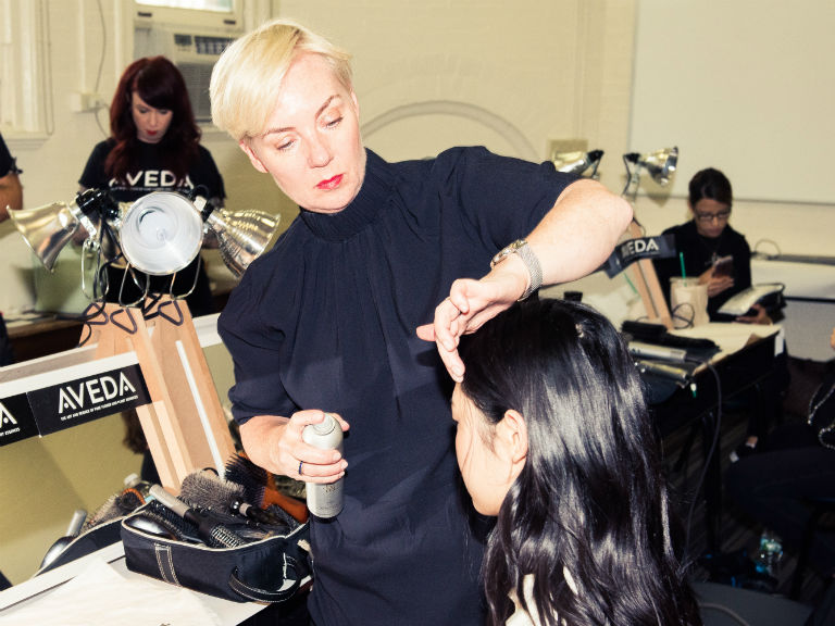 At the Stella McCartney Resort 2018 presentation in New York City, tropical embroidered dresses were complemented with loose, flowing waves. Aveda Global Creative Director, Antoinette Beenders, used NEW Aveda Shampure™ Thermal Dry Conditioner (featuring an aroma with 25 pure flower and plant essences including certified organic lavender, petitgrain and ylang ylang) to instantly detangle, condition and soften hair before a fun garden party.