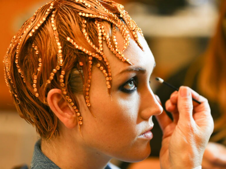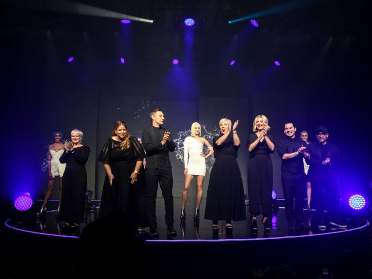 The artistic tribute featured models in distinct hair styles that appeared liquid-like when they walked the runway wearing dresses of acrylic that evoked the look of splashes. Eco glitter, sequins and recycled crystals adorned intricate hair styles that included finger waves and geometric cuts colored in vivid hues by Ian Michael Black, Global Artistic Director, Hair Color.